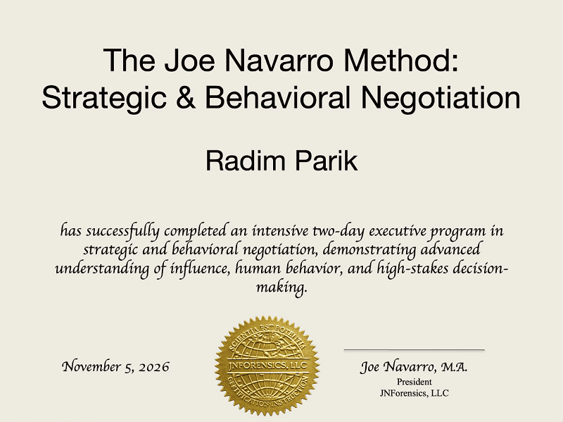 Vyjednávání, když jde opravdu o hodně, vyučované legendou FBI. Vedeno Joem Navarrem — světovou jedničkou v oblasti řeči těla — ve spolupráci s Radimem Paříkem, prezidentem Asociace vyjednávačů a zakladatelem Fascinating Academy & Partners.